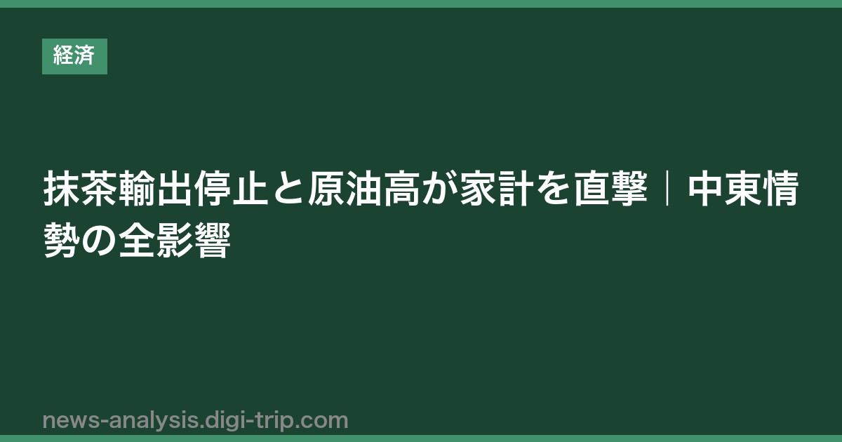 2026年3月、アメリカとイランの攻撃の応酬が続く中東情勢の悪化が、日本の身近な産業や家庭生活にまで深刻な影響を及ぼし始めています。静岡市の製茶会社が中東向けの抹茶輸出を停止せざるを得ない状況に追い込まれ、さらには原油高による家計負担増の試算も相次いで報じられています。本記事では、今回の事態の背景から具体的な影響、そして私たちが取るべき対策まで、わかりやすく解説します。
